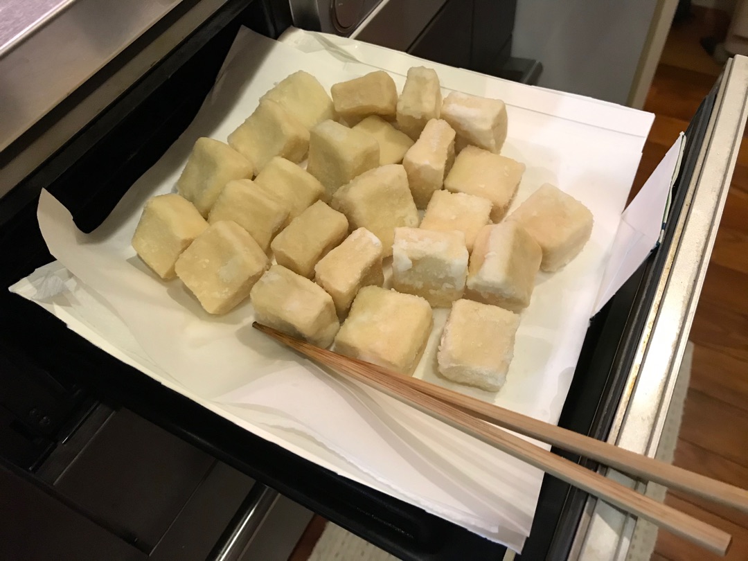 揚げ出し豆腐だとこのときによくはねるんですが、高野豆腐はその点油はねがほとんどないのもいいんですよね~(*´∀`)