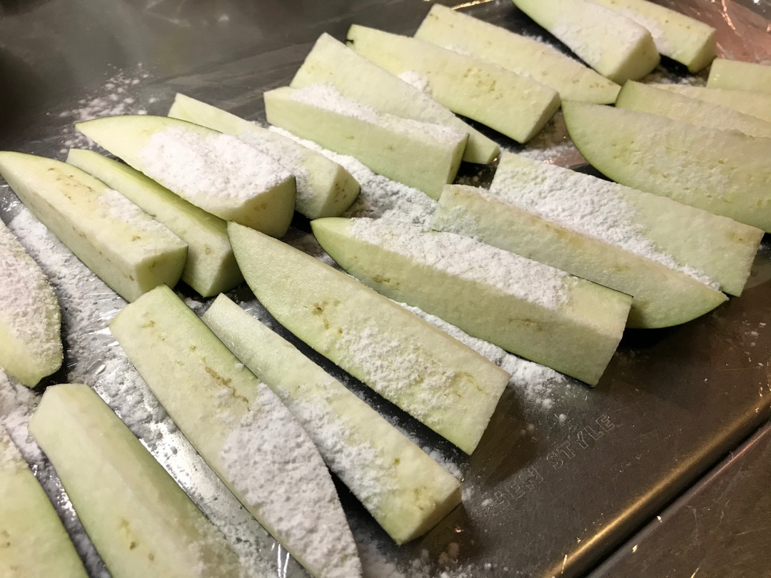 ホントはボウルやお皿に片栗粉を出してナスに丁寧につけるのがいいかと思いますが、