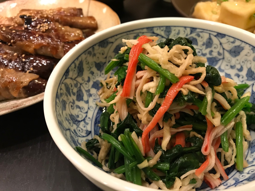こちら、切干大根を水で戻さずにゴシゴシボウルの中で洗い、ざっくりカットした後、ほうれん草の茹でたものとカニカマをポン酢であえて、仕上げにごま油をタラリするだけです!