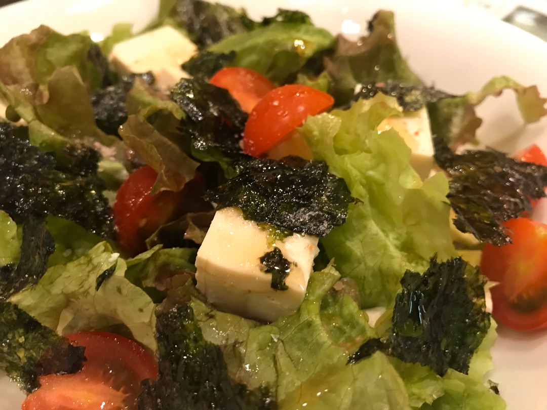 かろうじてサニーレタスとプチトマト、豆腐があったので、焼き肉屋さんで出てきそうなサラダにしてみました