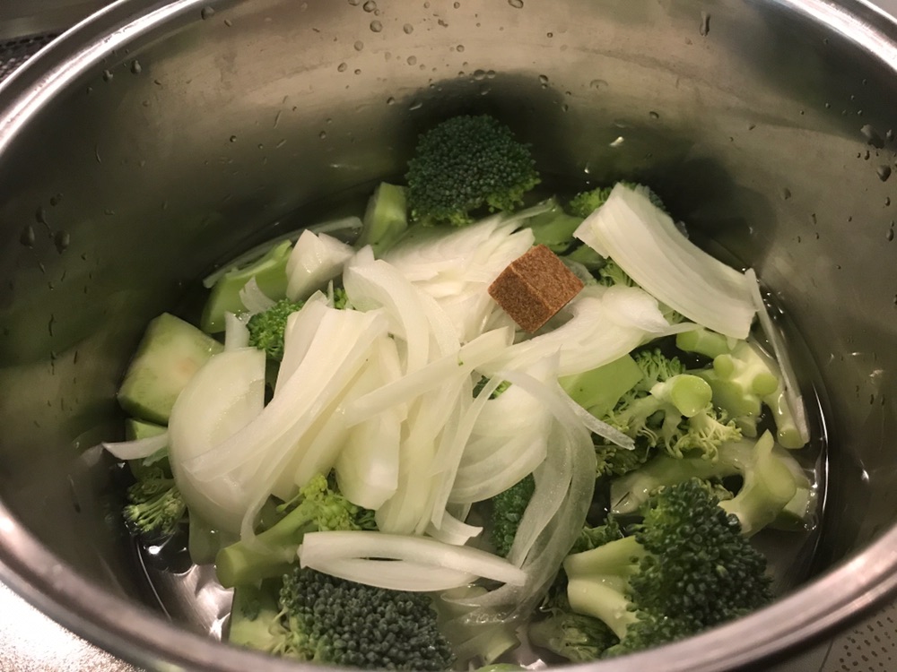 玉ねぎとブロッコリー、あとコンソメを入れてひたひたにお水を入れてブロッコリーかやわらかくなるまで煮て、その後ブレンダーでブィーンとやってからあとはお好きな濃度まで牛乳でのばします