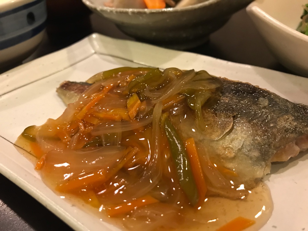 アジの甘酢あん。骨抜きのアジに野菜たっぷりの甘酢あんをかけました~