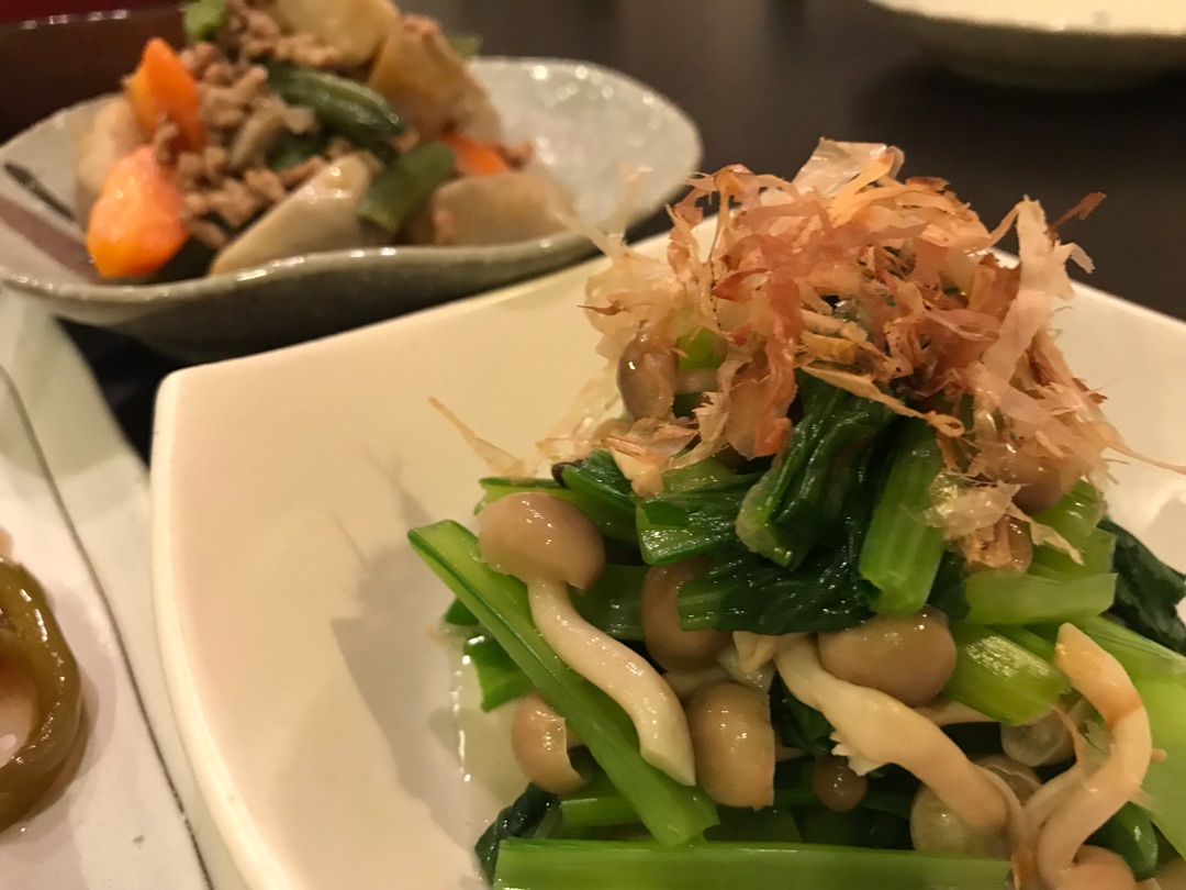 小松菜としめじのおひたし。いつもはおろしあえにするのですが、今回は大根なかったので普通におひたしにしました