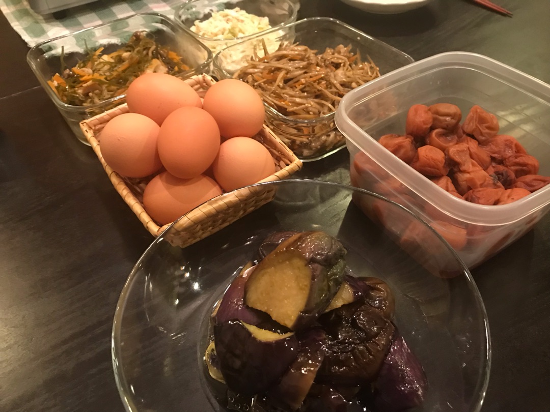 なので、あとは残り物のお惣菜とか梅干しとかを並べてバイキング方式(笑)