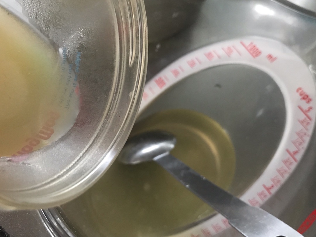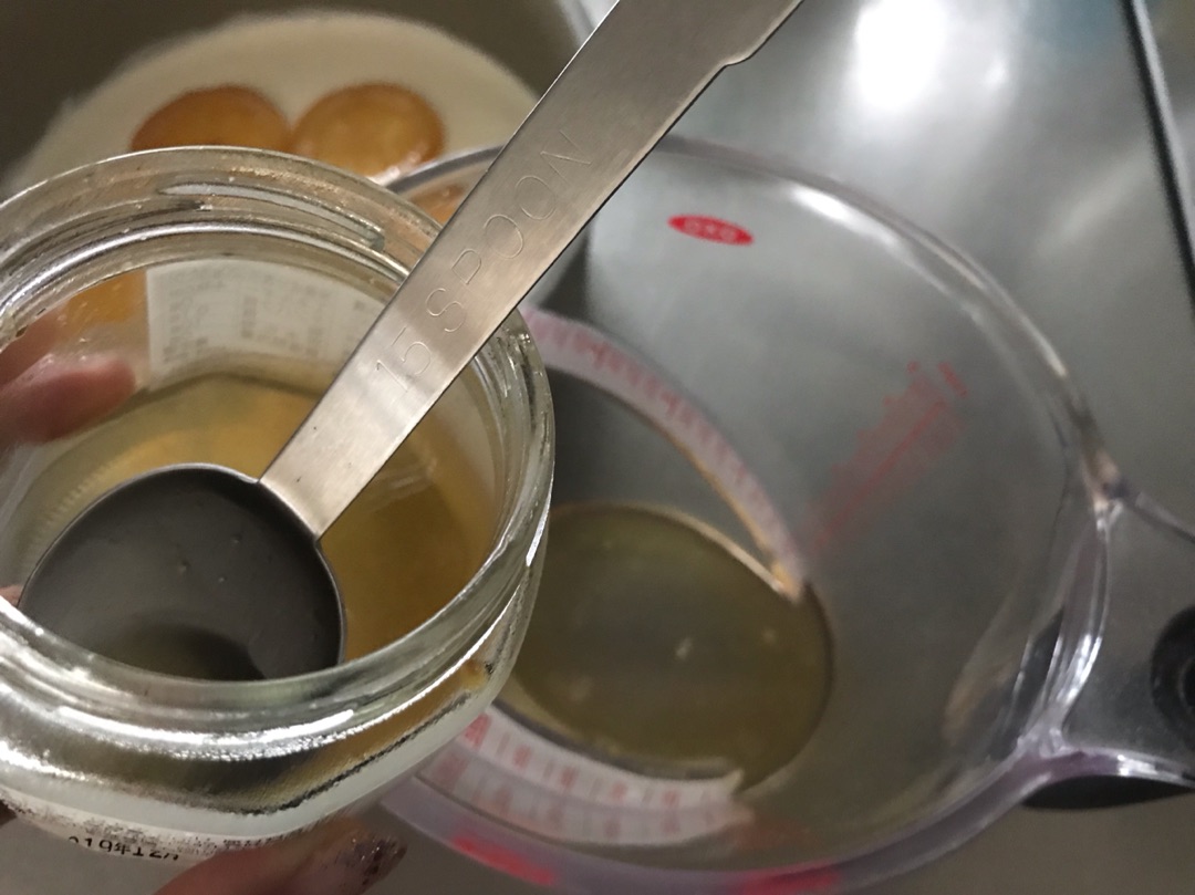 瓶の中の蜂蜜を大さじ3杯入れて水を200ccのところまで足しました