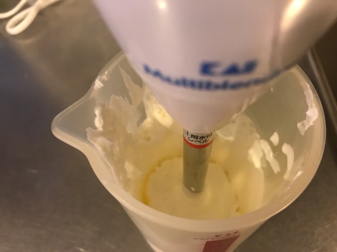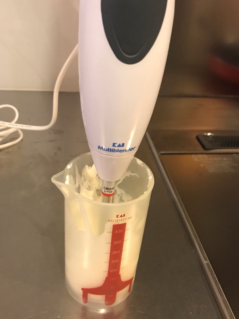 ケーキの飾りなんかに使うときの生クリームの泡立ては電動のハンドミキサーを使いますが、これぐらい(今回は100cc)の少量でしたらブレンダーの刃を泡立て用に変えてやっています^^
