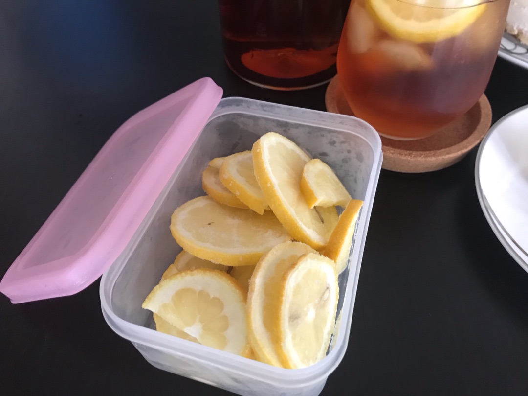 アイスティーの中に入れたレモンは、料理で使ったときに残ったレモンを輪切りにして冷凍ストックしているものです