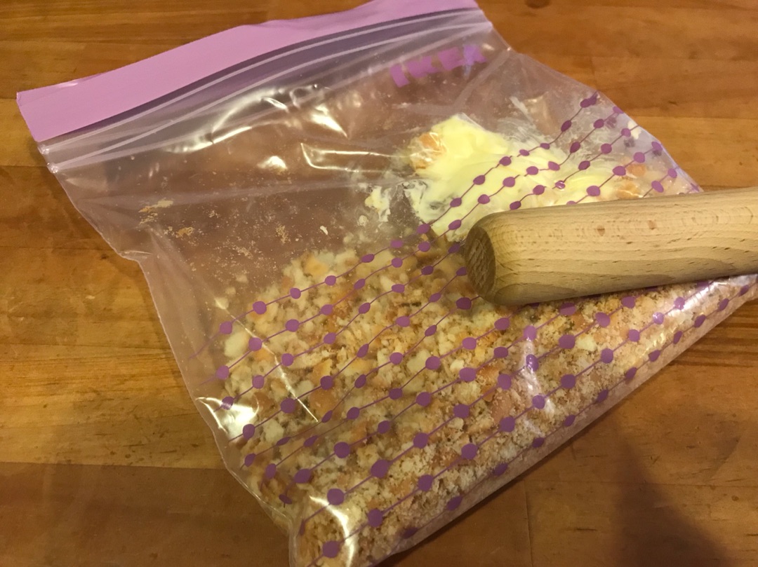 クラッカーをめん棒でバシバシ叩いて粉々にしてバターを加えてもみもみします。 で、