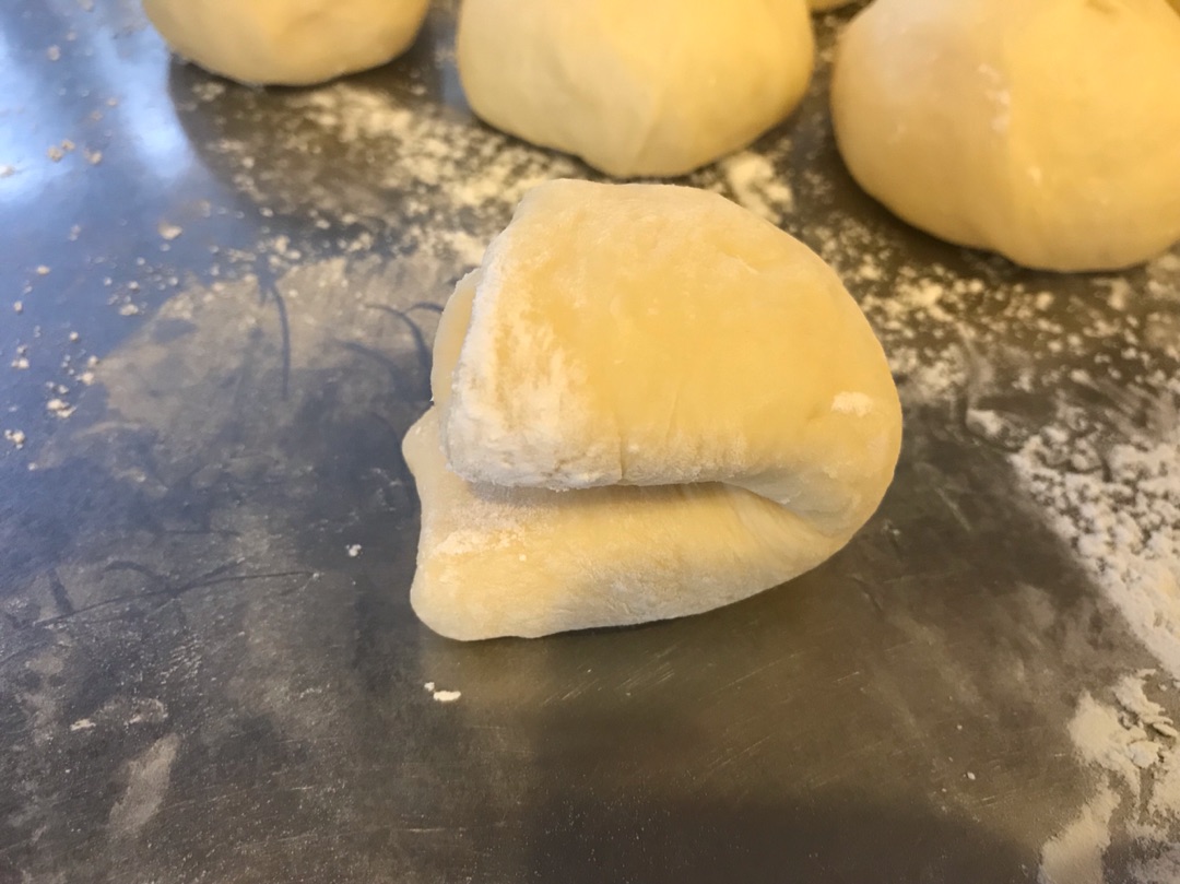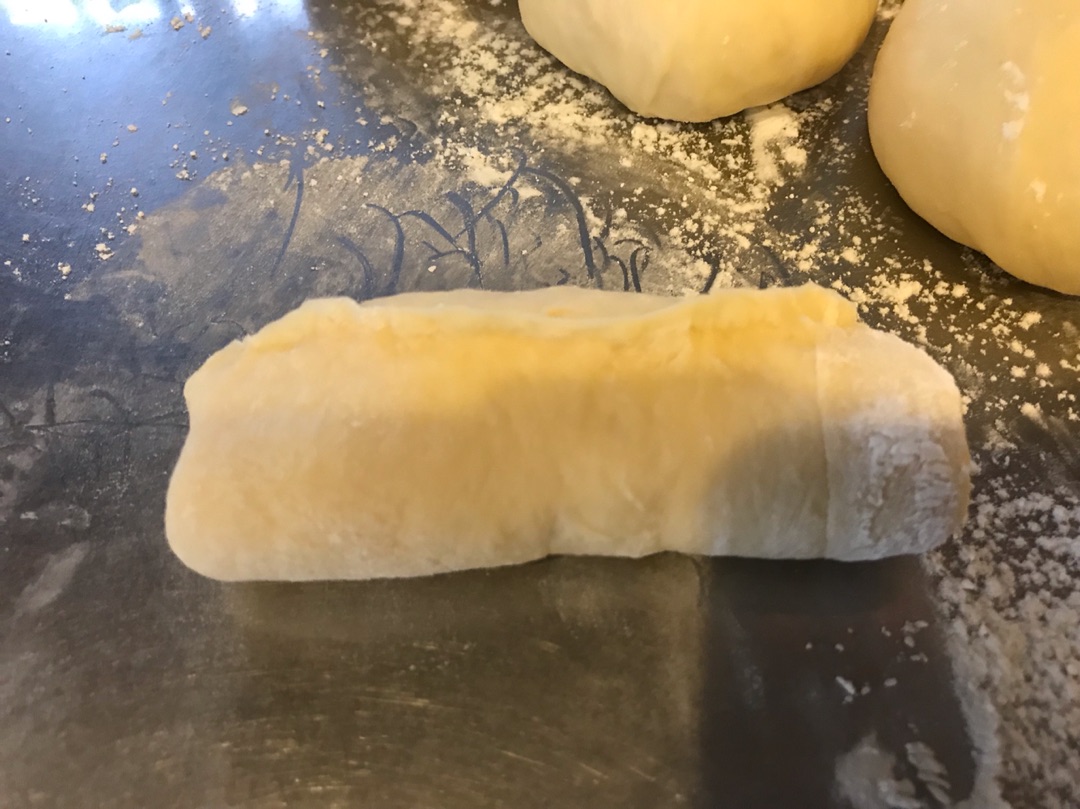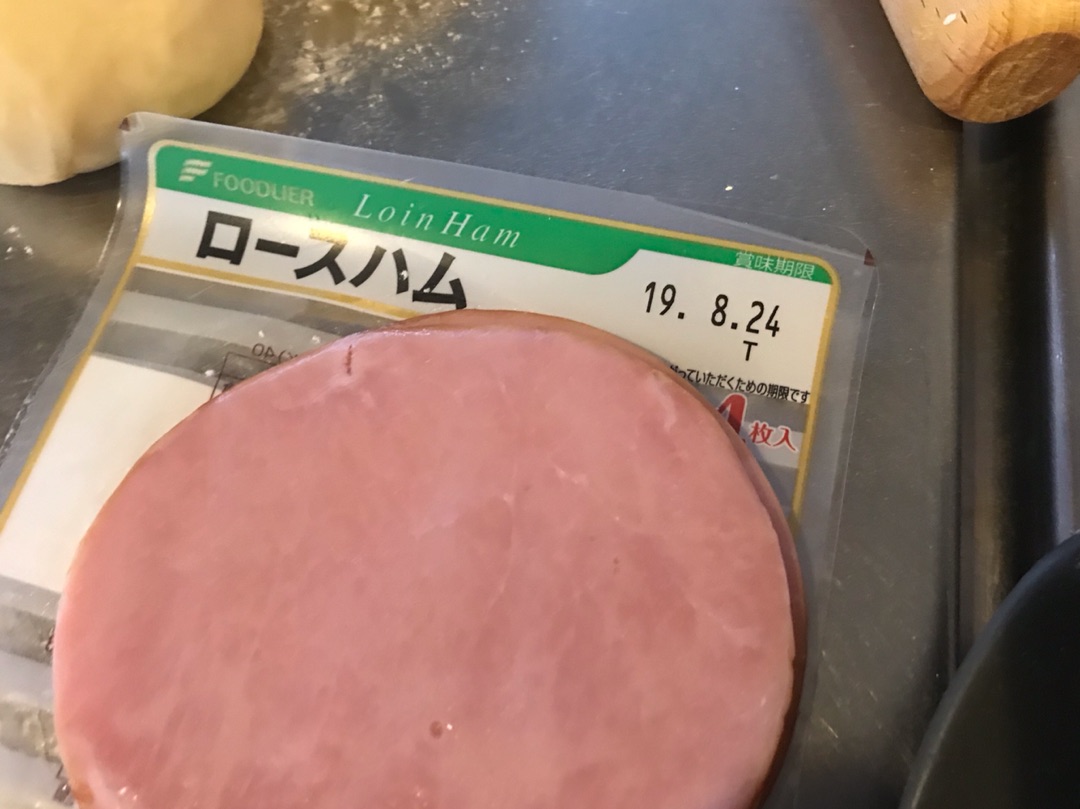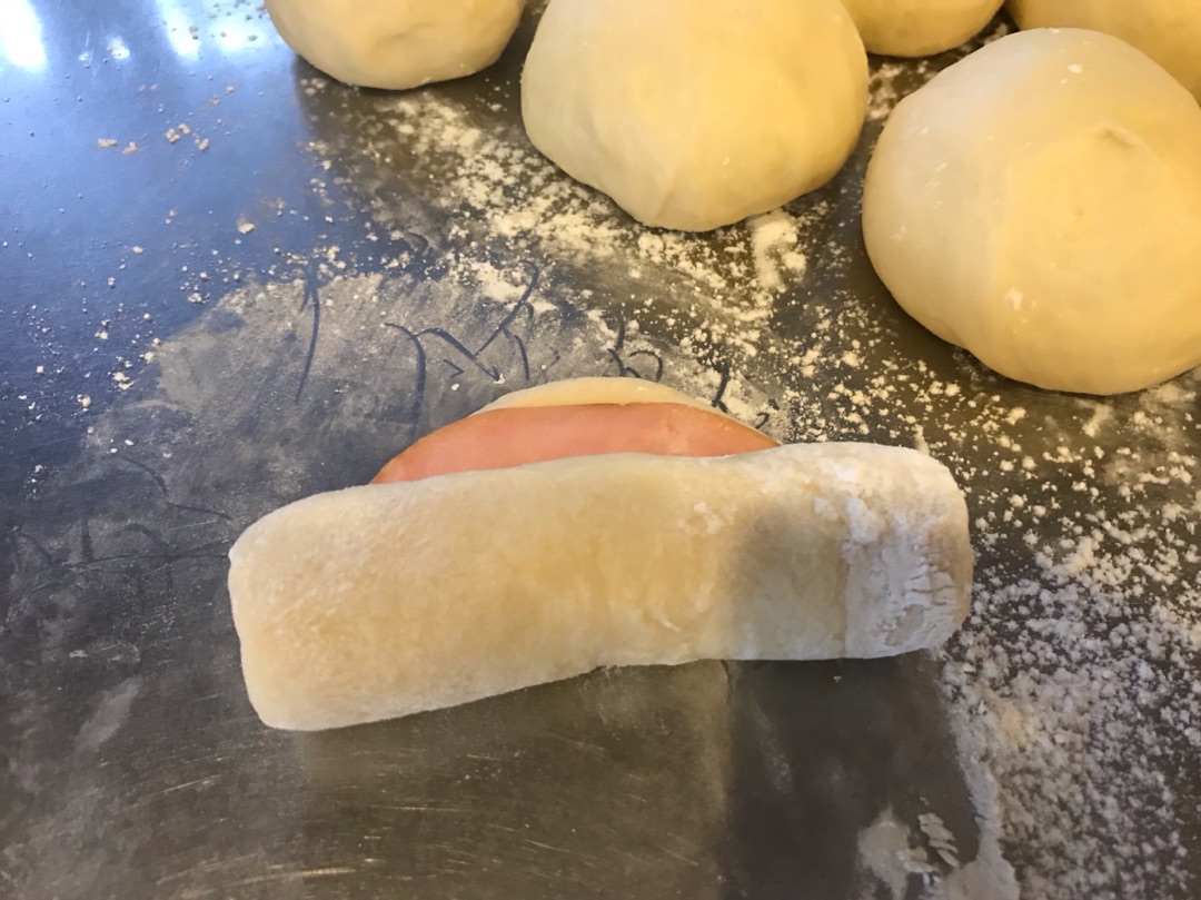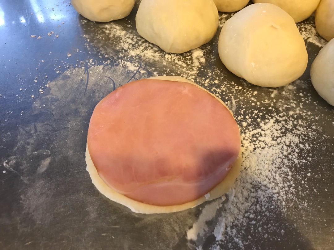 ベンチタイムが終わった生地をハムより一回り大きいぐらいに伸ばしたらハムを置いて・・・
