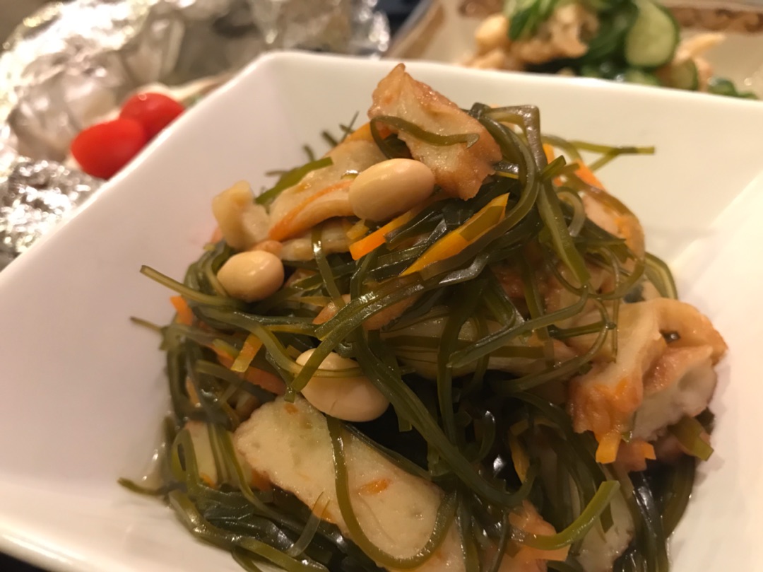 定番のお惣菜切り昆布の煮物。さつま揚げ、にんじん、大豆が入っています。