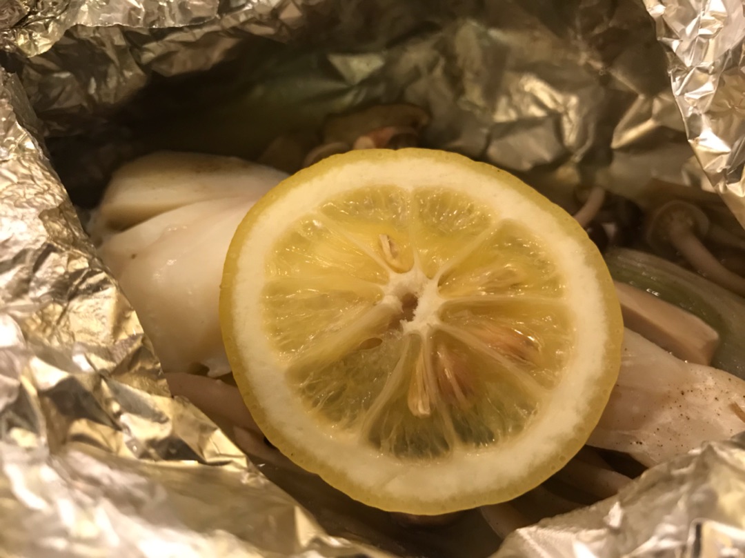 バター(うそ♡マーガリン)とレモンを乗せてホイル焼きにしてありまーす♪^^