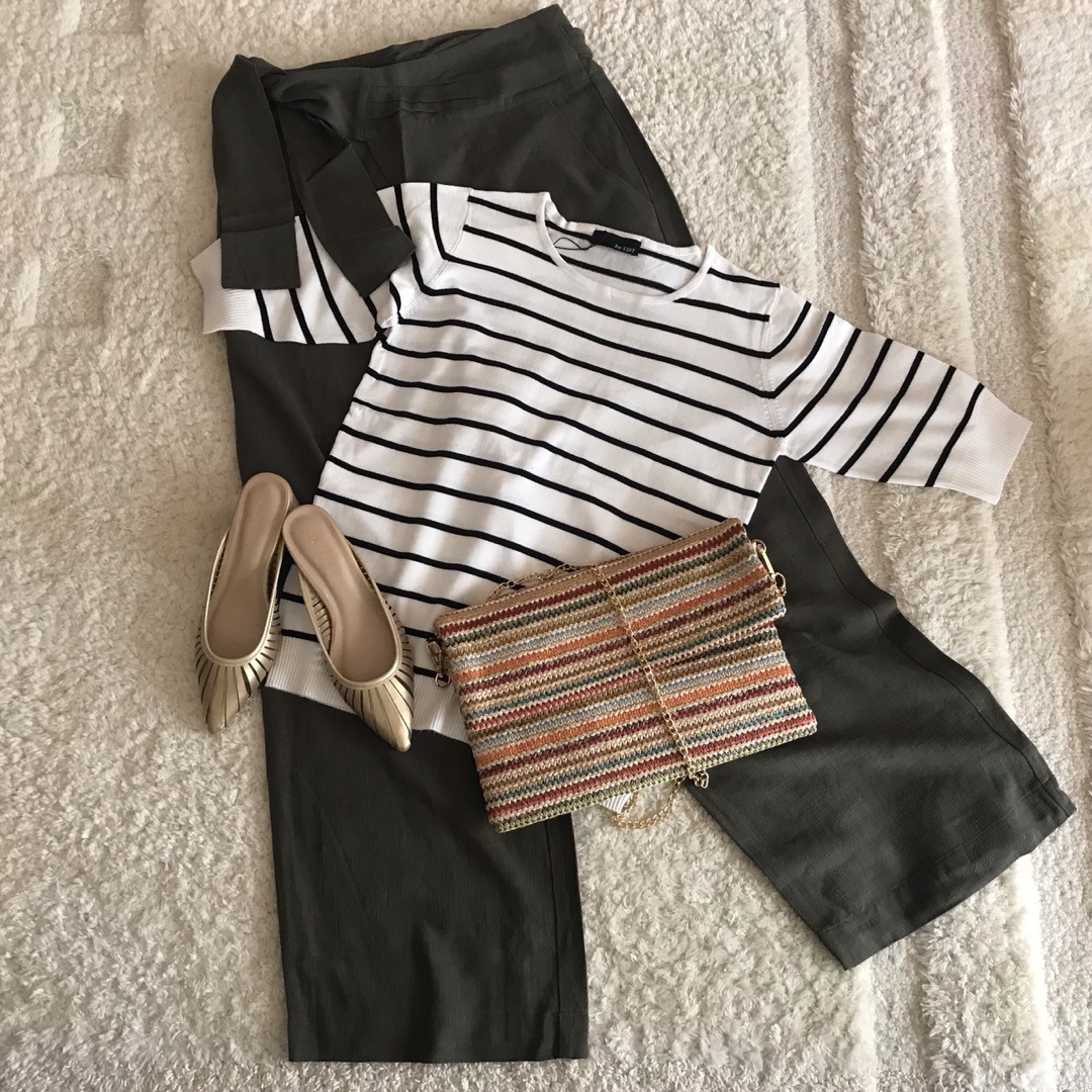 トップスはこちらの五分袖ボーダー。襟ぐりが2タイプから選べます^^