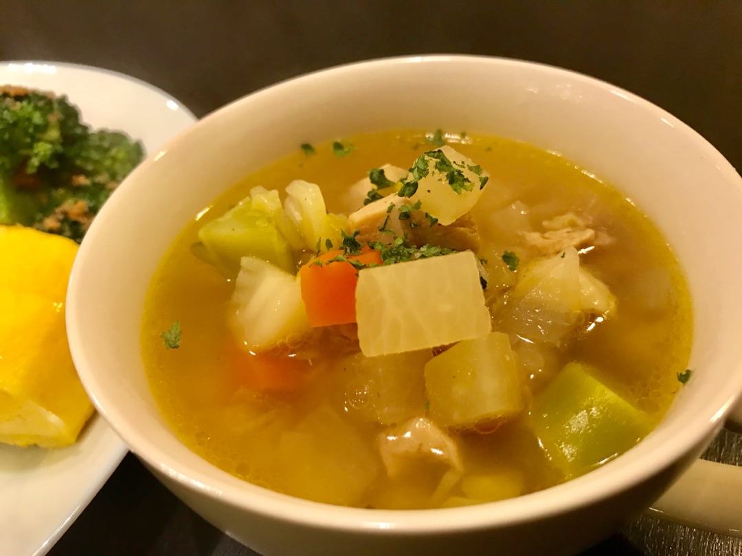 カレー風スープの味付けはカレー粉とコンソメだったと思います!詳しくはMizukiさんのレシピをごらんください(丸投げ)