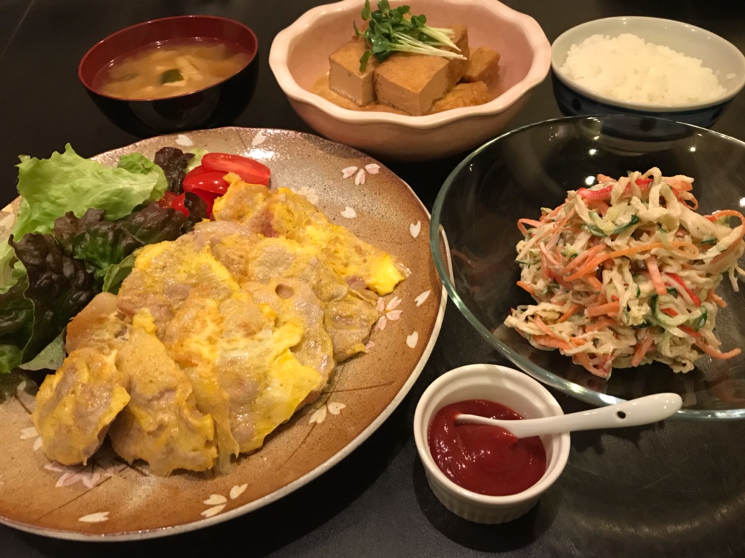 (火)豚肉のピカタ、厚揚げの煮物、切り干し大根のサラダ
