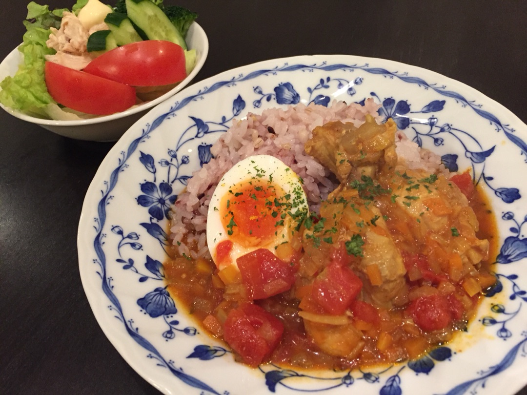 手羽元だけにんにくと一緒に圧力鍋で煮ておき(朝のうちに)、そのスープとトマト缶を使って、ルーではなくカレー粉でつくるカレーです!