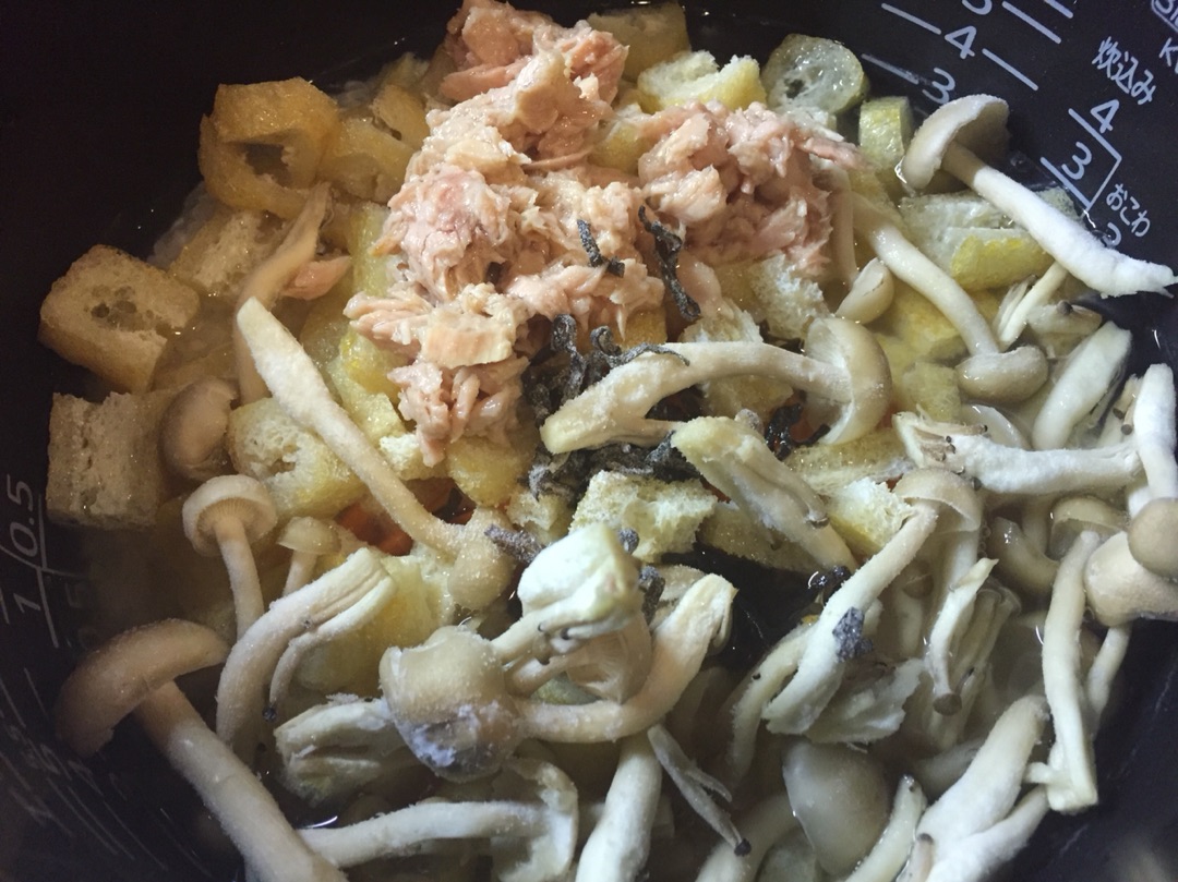 揚げ、にんじん、しめじ(冷凍のまま)、ツナ缶、塩昆布を入れました!