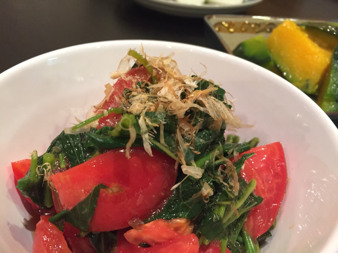 モロヘイヤとトマトのポン酢あえ。もう名前のとおりの調理法(笑)
