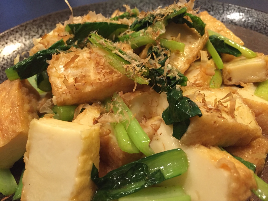 厚揚げに火が通ったら小松菜の葉っぱの部分を入れて、味付けはお醤油・みりん・オイスターソースを2:1:1ぐらいの割合でまぜたものを回しかけて強火で香ばしさを出します!