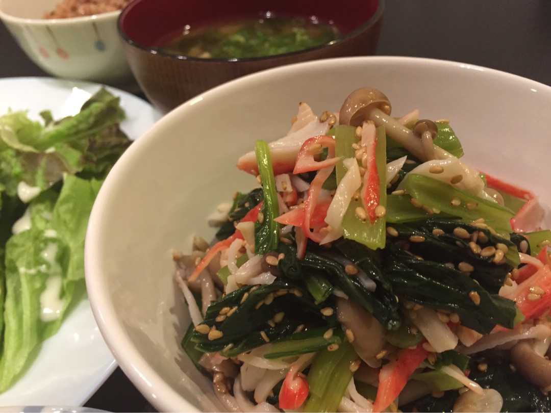 小松菜としめじはレンチン、ギュッと絞ってからカニカマとあえました!^^