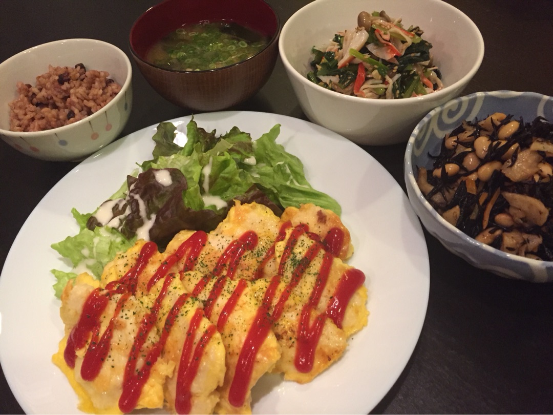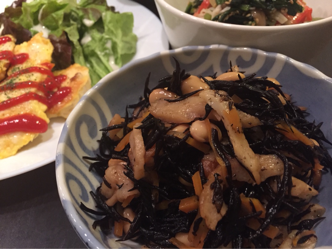さっきの方法で下処理した鶏ムネ肉を薄いそぎ切りにして、ビニール袋に入れて小麦粉をまぶします! あとは普通のひじきの煮物~^^ 小松菜とカニカマのナムル。 鶏ガラスープの素は結構塩気があるので、塩は味見しながら入れてみてくださいね~^^