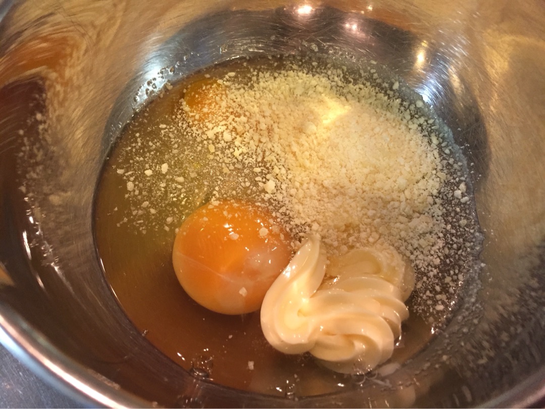 卵、粉チーズ、塩コショウ少々、あと、ホントは生クリームとか入れるんでしょうけど、私はかわりにマヨネーズを入れます!