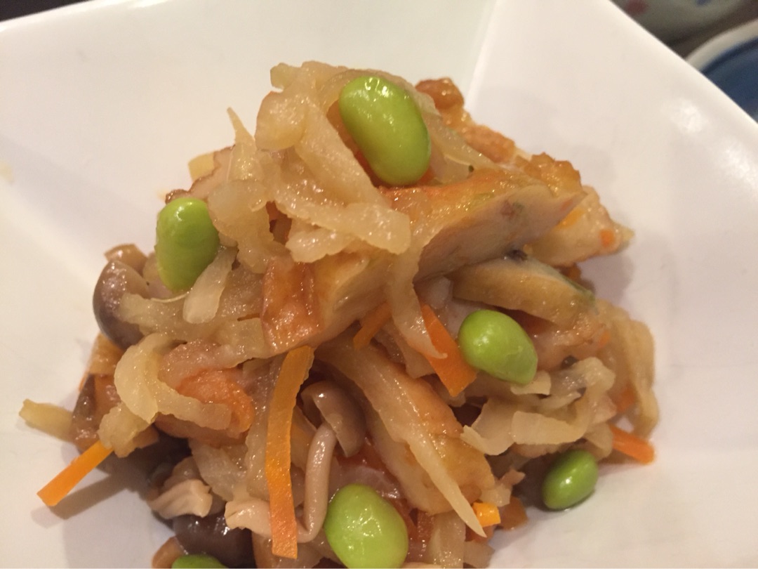 切り干し大根の煮物。にんじん、しめじ、野菜天、枝豆が入っています^^