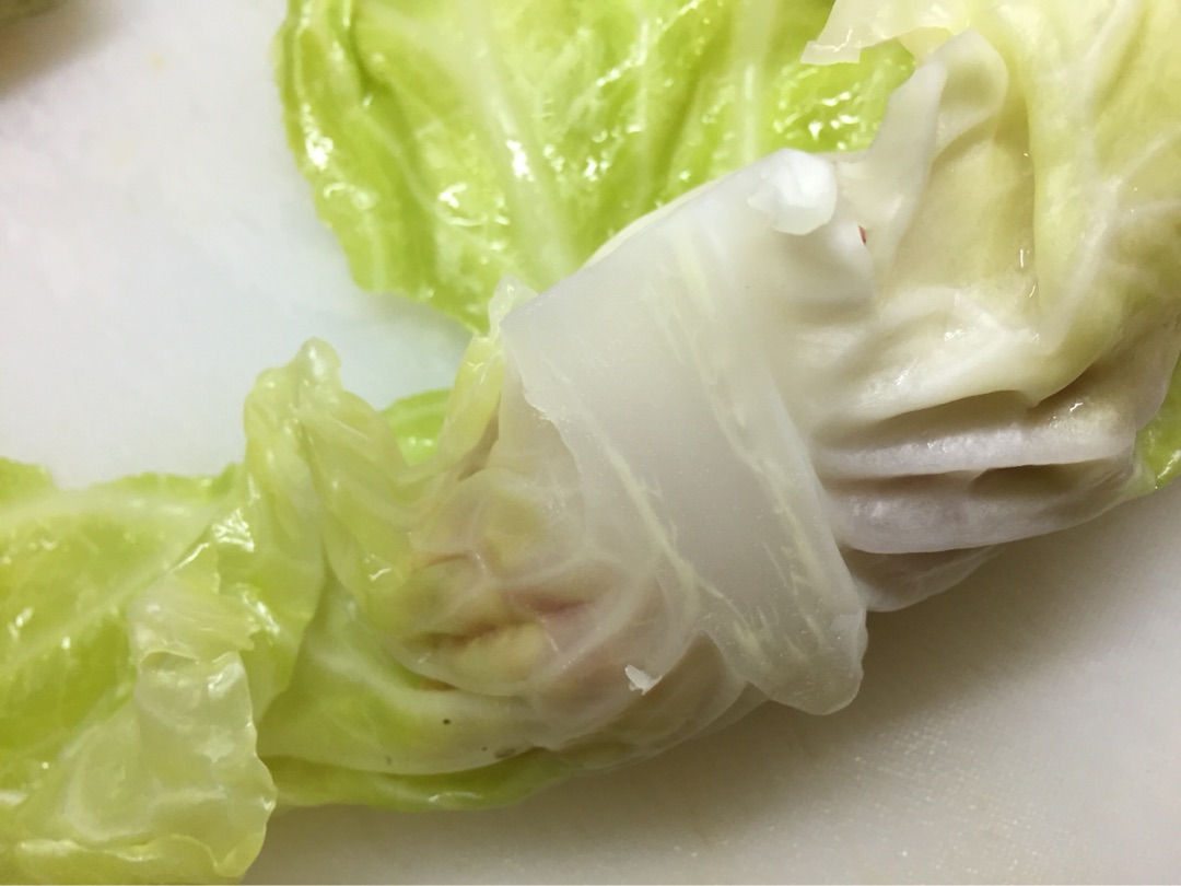 ロールキャベツ、巻くときに芯のところはカットする方も多いかと思いますが、私はこのように固い部分は削いで・・・・
