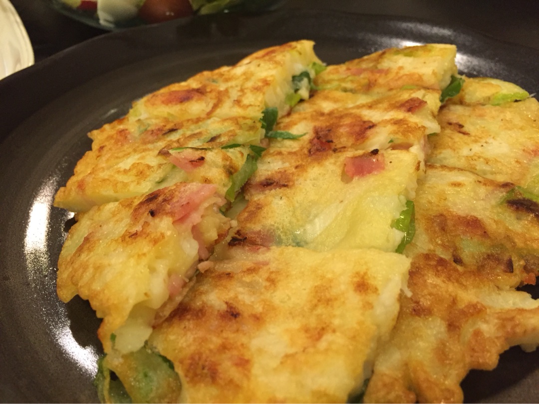 市販のチヂミ粉は不要だし、中身もベーコン、チーズ、長芋、ネギと普通のチヂミより具だくさんでおかずになります!^^