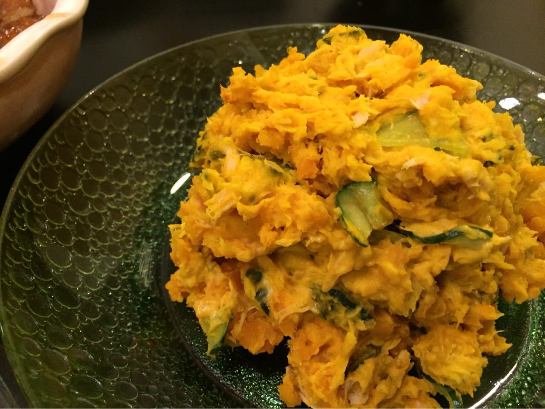 昨日はハムがなかったのでツナ缶です。そして、レーズンもなくて、アクセントがないカボチャサラダはちょっと寂しい感じ。きゅうりと新玉ねぎも入っています^^