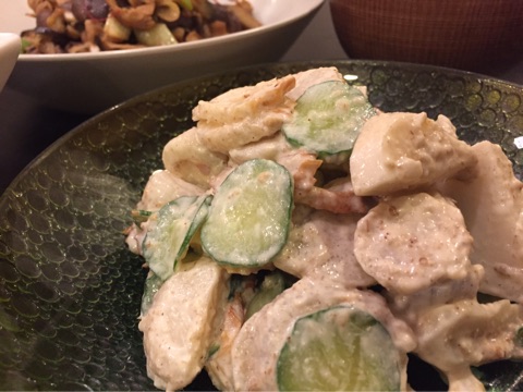 里芋は皮つきのままレンチンしてやわらかくして輪切りに。きゅうりも輪切りにして軽く塩揉みしておきます。この日はちくわが余っていたのでちくわを入れましたが、彩りからいったらハムとかカニカマとかのほうがいいかも~(^^;