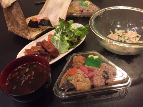デパ地下おこわ弁当(+天むす2個)&インスタント味噌汁、そして残りおかずですー!ヽ(;´Д`)ノ