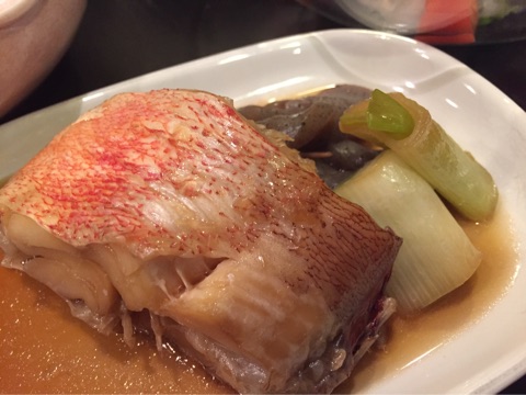 赤魚の煮付け。淡白な白身のお魚なので、ちょっと濃いめの煮汁で、こんにゃくとネギも一緒に煮ました~♪