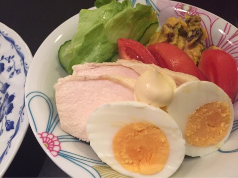 レタス、きゅうり、トマト、ゆで卵、つくりおきのサラダチキン、あとは昨日のカボチャサラダも残っていたので一緒に盛り付けました~(笑)