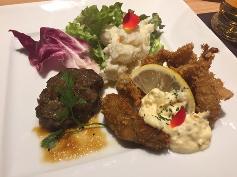 メインは牡蠣フライと何かの魚のフライと、あと牛肉100%(多分)のハンバーグ。