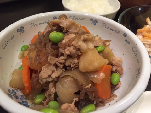 そして、定番の肉じゃが~♪お肉は豚バラ肉です。ウチは牛は滅多に使いませーん(笑)