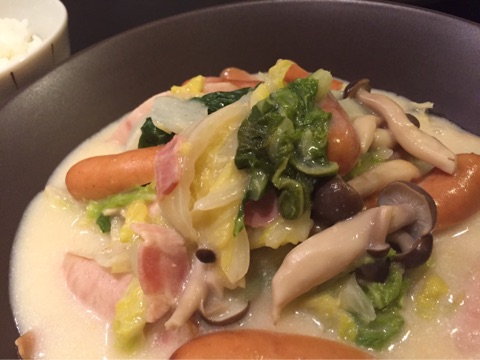 白菜のクリーム煮。レシピは豚肉でしたが、メインがハンバーグだったのでウインナーに変更しました(笑)