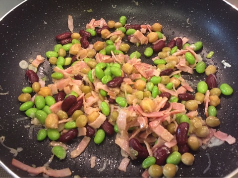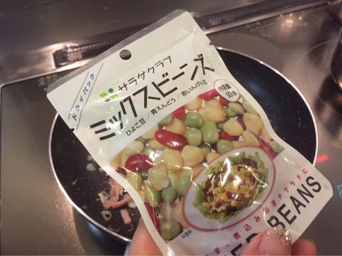 ネギがしんなりしてきたら、そこにミックスビーンズを投入。