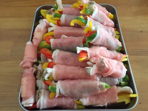 大量の肉巻き(笑)中身はパプリカ(赤・黄)、ピーマン、エリンギです!^^