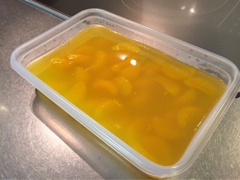 で、寒天1袋で500ccの液体を固めることができるので、この缶詰のシロップに、+300ccオレンジジュースを足してつくればオレンジジュースも少しで済みます!(≧▽≦)