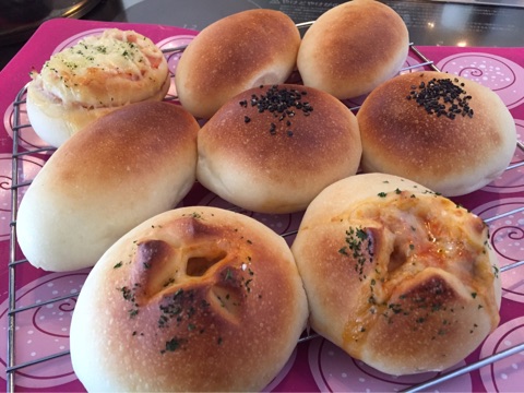 左上はハムマヨネーズ、その横の楕円のはチョコパン、黒ごまはあんパン、手前の二つは前日のチキンのトマト煮込みを入れたパン(←どんだけ使い回し?!:笑)の合計4種類です!