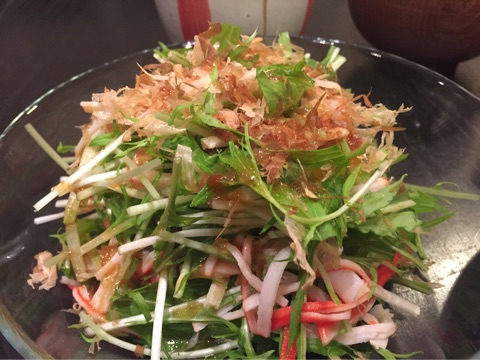 水菜とカニカマのサラダ。ストックのツナ缶を切らしてしまい、2品だけの寂しいサラダになってしまったので上にかつおぶしをかけてごまかしました(^^;