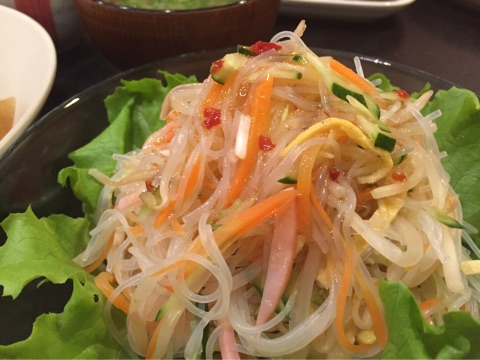 春雨サラダ。入っているのは、もやし、にんじん、きゅうり、ハム、薄焼き卵です。和風ドレッシングをかけていますが、お子様にはマヨネーズ味もいいかも♡