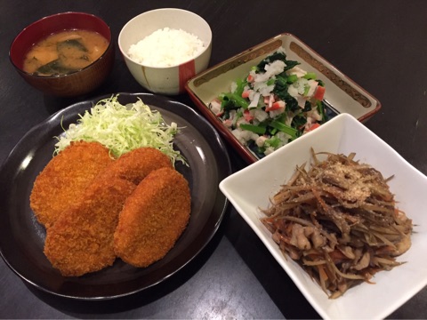 (月) コロッケ(お惣菜)、オイスターきんぴら、小松菜とカニカマのおろしあえ、