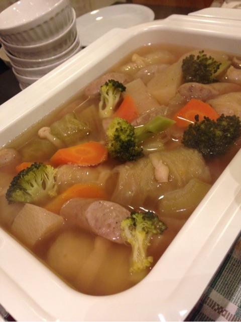 朝、ランニングに行く前に1時間だけ煮込んでおいたポトフ。ロールキャベツは冷凍のものを使いました。