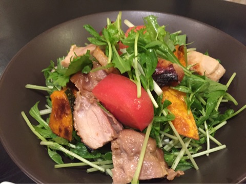 ③照り焼きチキンサラダ照り焼きチキンと豆苗、水菜、素揚げしたかぼちゃ、れんこん、あとトマトが入ったおかず系サラダ。
