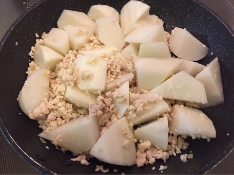みじん切りのしょうがをごま油で炒めて、そこにミンチを入れます。ミンチがポロポロになったら乱切りにした大根も加えます。下ゆでとか不要、生のカットした大根でOK♪