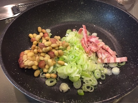 中の具材は、ねぎ、ベーコン、ミックスビーンズです。これをサラダオイルで炒めて、塩コショウ、仕上げにお醤油少々で味付け。これ、タマネギじゃなくてネギのほうが絶対おいしいです!あと、お子様にはベーコンじゃなくてウインナーでもいいかも^^