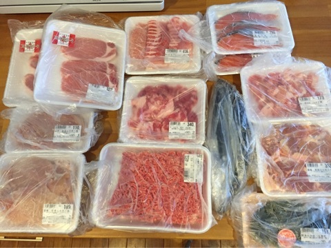 鮭切り身、豚こま、鶏もも肉、生わかめ、合い挽きミンチ、鶏ムネ肉、豚ロース(トンカツ用)、豚バラ薄切り、牛こま、最後に真ん中の細長いのはサンマです!!
