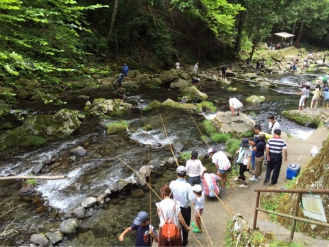 滝から流れる川では貸し竿でアマゴ釣りができます!