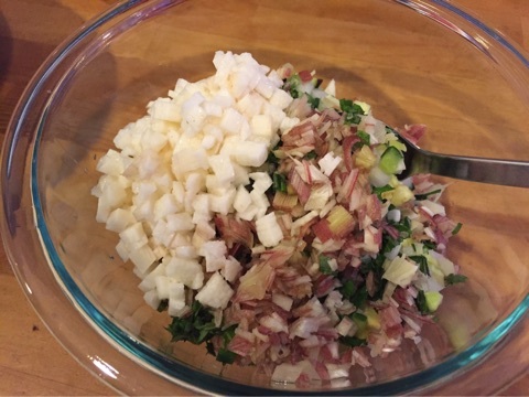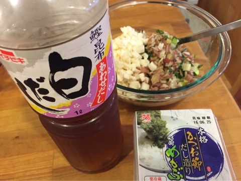 私のダシの中身は、山芋、茄子、きゅうり、大根(以上は全部5ミリ角に切る)、ミョウガ、ショウガ、大葉(こちら三つはみじん切り)です。きゅうりと大根は塩揉みしておきます。